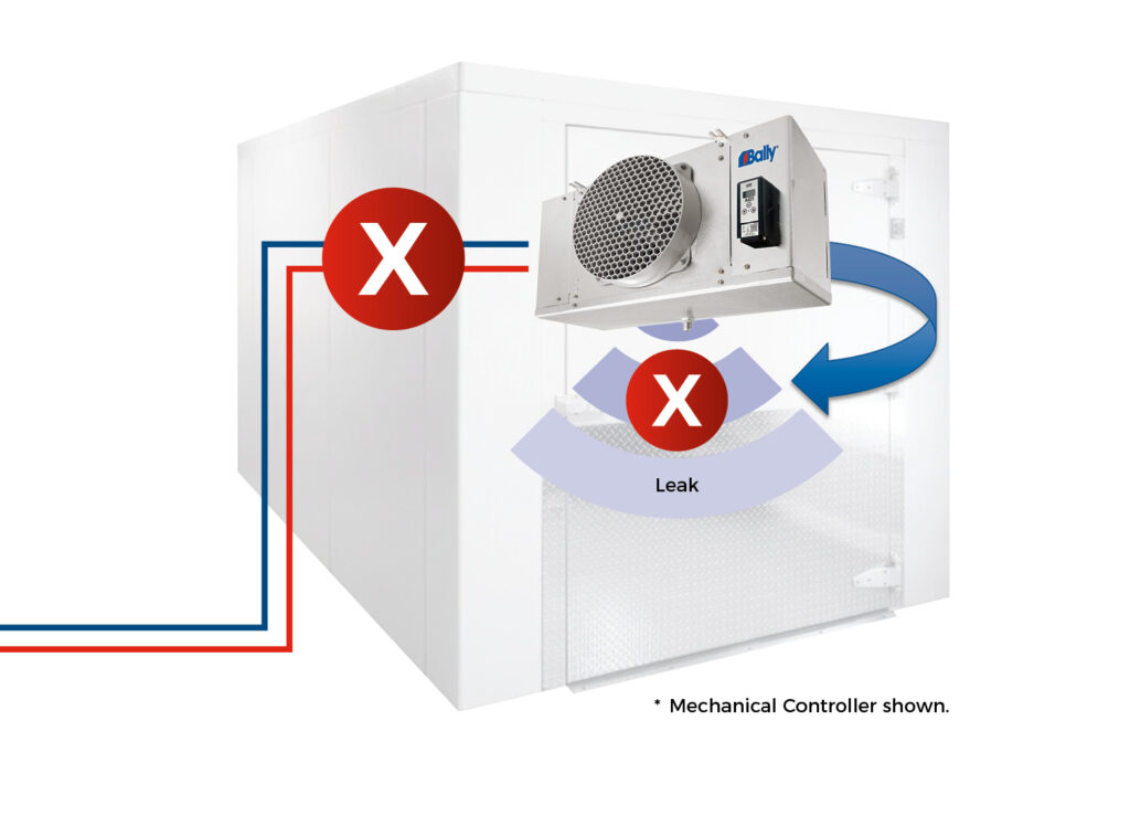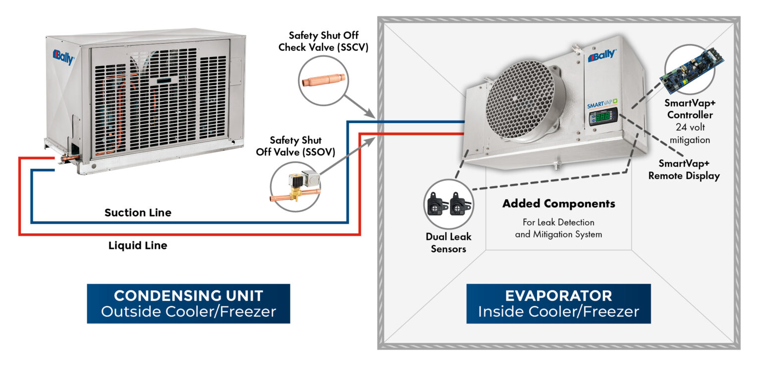 When a sensor detects a refrigerant leak, the safety shut-off valves will isolate the evaporator to limit the releasable charge leaked and keep the evaporator fans running to circulate the air and dissipate the gas.